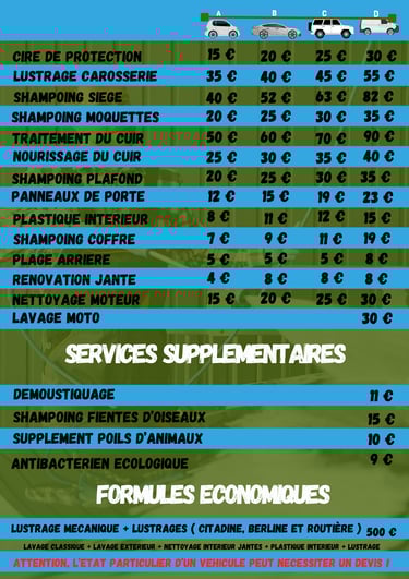 Nos services complémentaires comprennent un shampoing pour les fientes d’oiseaux, un supplément en cas de poils d’animaux, l’utilisation d’un antibactérien écologique. Nous pouvons également démoustiquer vos parebrises et pare-chocs.
